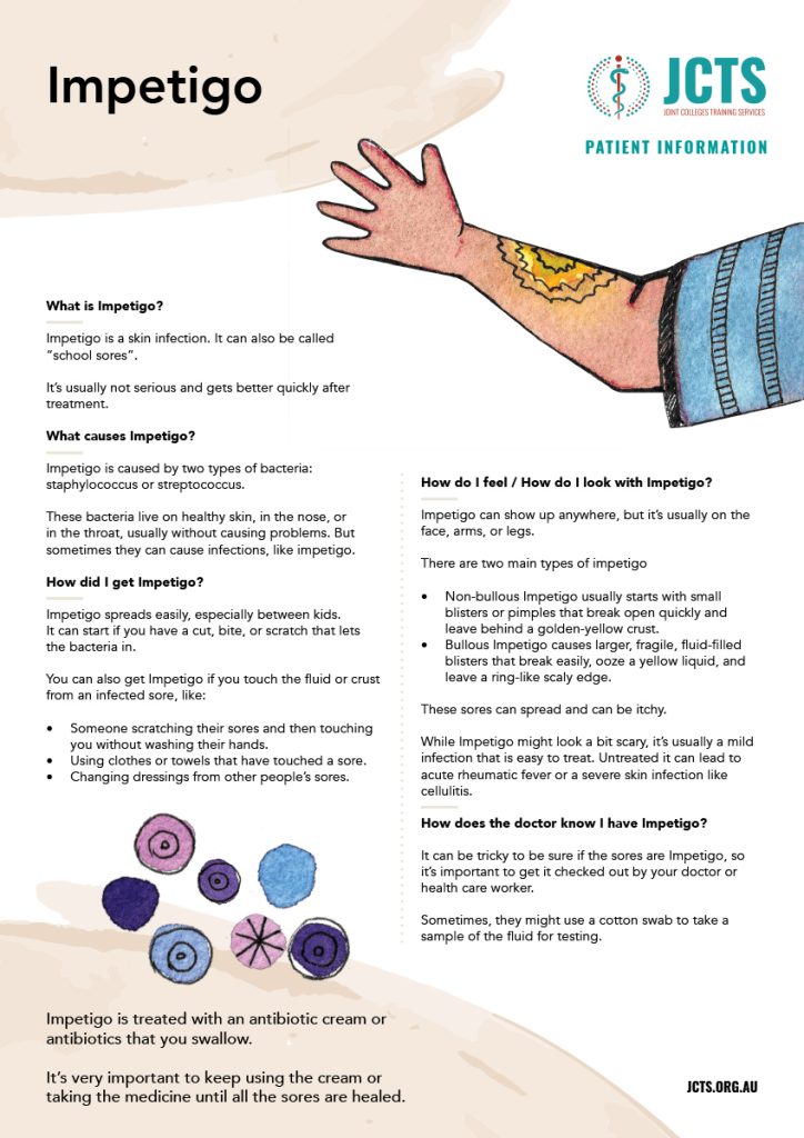 Impetigo is a skin infection. It can also be called “school sores”.